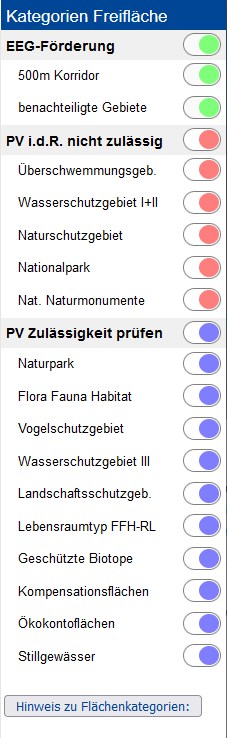 Ein- und Ausschalten von Dateneebenen von Flächen mit möglicher EEG-Förderung und Gebiete, bei denen die Zulässigkeit einer Freiflächenanlage zu prüfen ist.